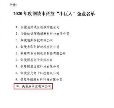 由铜陵市经信局、科技局、发展投资集团公司三家单位联合开展的2020年度铜陵市“科技小巨人”企业认定工作,铜都流体子公司英诺威阀业有限公司榜上有名。