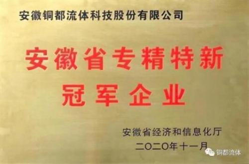 日前,据安徽省经济和信息化厅网消息,铜都流体荣获2020年度“安徽省专精特新冠军企业”称号。