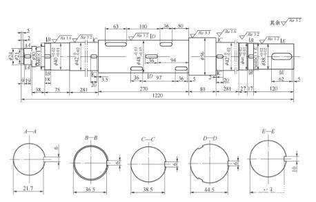 5)半精车。先半精车任何一端都可以,为了节约时间,不倒换中心架和拖板,直接开始半精车工件的左端。半精车时,转速可提高到240r/min,吃刀量0.6mm左右,进给量0.1mm/r。把中心架和跟刀架的支撑力度调整到最佳,使车削过程中无颤动现象。这样进行每一个台阶的半精车,留余量0.4mm精车,同时把工件台阶φ56mm精车到自由公差,然后精车每一个台阶长度尺寸到要求,用深度游标卡尺测量。用同样的车削方法,半精车工件的右端。