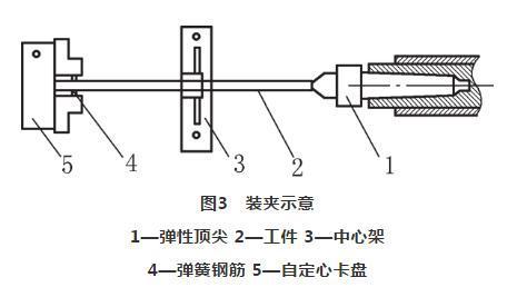 (4)装夹方法氨水泵不锈钢细长轴的材料选用316L,由生产方自送,直径60mm。加工过程中为了防止跟刀架与卡盘产生碰触,经过测量计算,坯料的长度要比工件实际长度长350mm左右,从而满足跟刀架的正常使用。本细长轴采用一夹一顶的装夹方法,装夹过程中要考虑重复定位的影响,因此我们准备了3件长度20mm、直径6mm的材质较硬的弹簧钢筋,横向垫放在自定心卡盘的每一个卡爪与工件接触部分之间,装夹接触部分为线接触,可以很好地消除重复定位的负面影响,如图3所示。