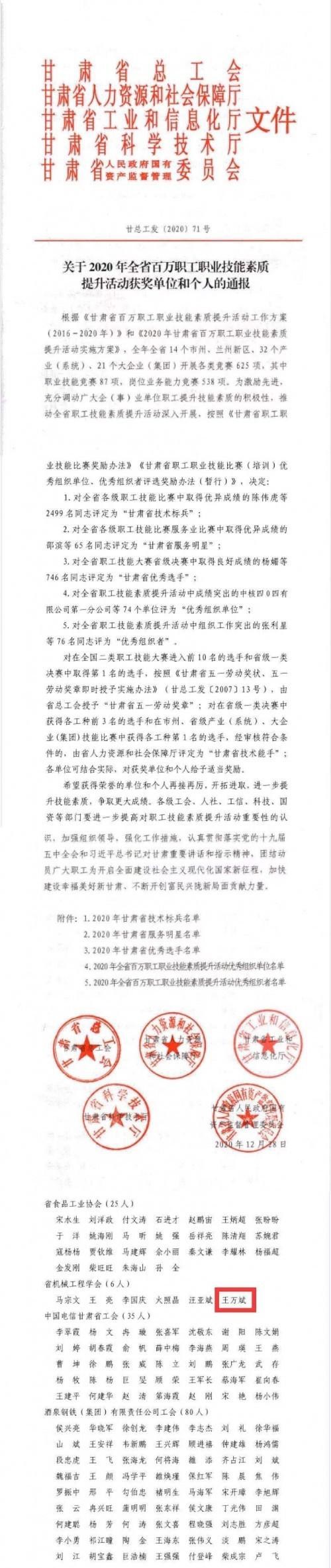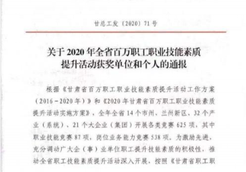 近日,甘肃省总工会对2020年全省百万职工职业技能素质提升活动中取得优异成绩的单位和个人进行了通报表扬,兰州高压阀门有限公司员工王万斌在竞赛中经过理论知识、实际操作等环节的激烈角逐,从参赛选手中脱颖而出,荣获“甘肃省优秀选手”荣誉称号。