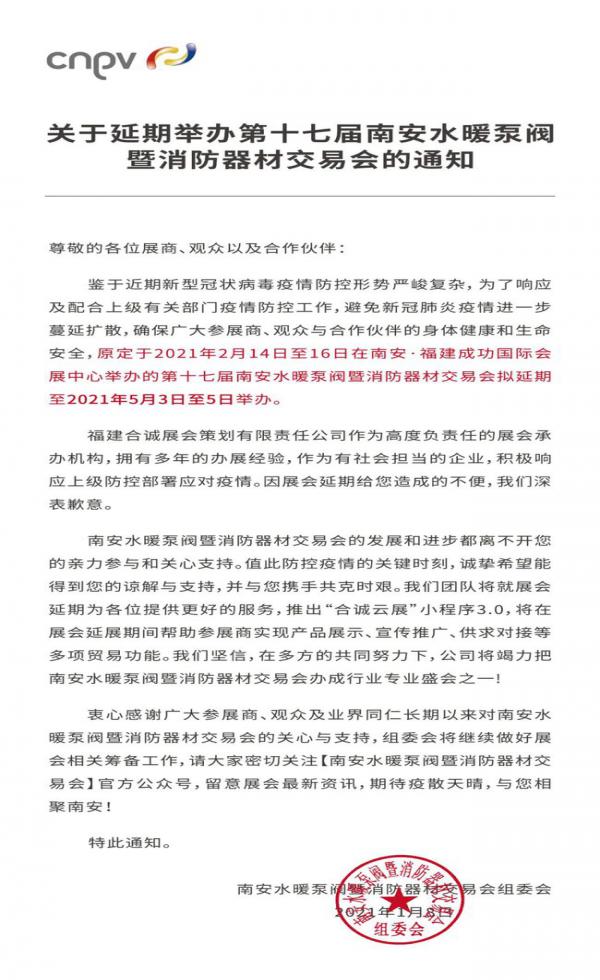 【通知】第十七届南安水暖泵阀暨消防器材交易会延期举办!
