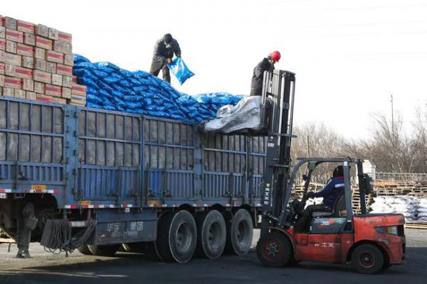 哈密市蓝色火宴新能源开发有限责任公司工人在装载销售产品。( 记者 邢宝玉)