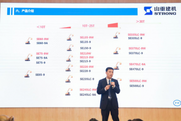 活动上对新产品的技术特点和性能参数做出了详细的讲解。新产品采用具有国际先进水平的新一代拥有自主知识产权的核心动力液压系统总成,搭载专为挖掘机产品量身定制的潍柴最新N、H高端平台发动机,配置LINDE正流量重载液压系统,匹配SHANTUI全套底盘件、自主电控系统,智能人机交互显示屏,集合了山东重工集团最优势产业配套资源,是山重建机产品集群力和技术竞争力的充分体现。