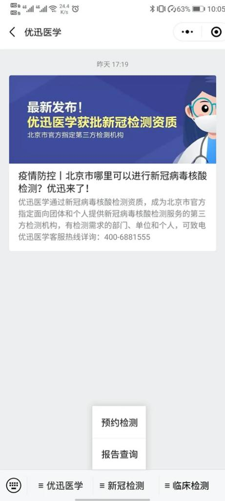 →进入“优迅医学”微信公众号→点击菜单中的新冠检测—报告查询
