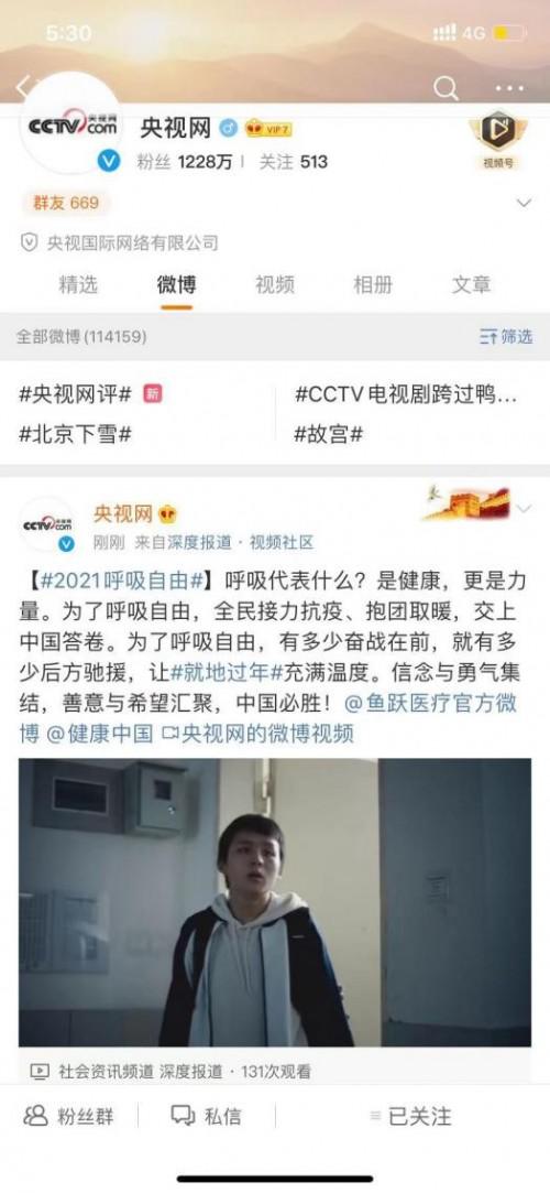 1月27日,央视网官方微博发布了一部公益电影,这是一部聚焦全世界呼吸健康的公益电影,由国内医疗器械企业鱼跃医疗制作。2021年农历新春在即,为防止新冠疫情的再次反弹,国家号召并提倡减少春节流动,就地过年。在国民健康意识再一次被调动之际,“自由呼吸”成了无数国人的诉求。