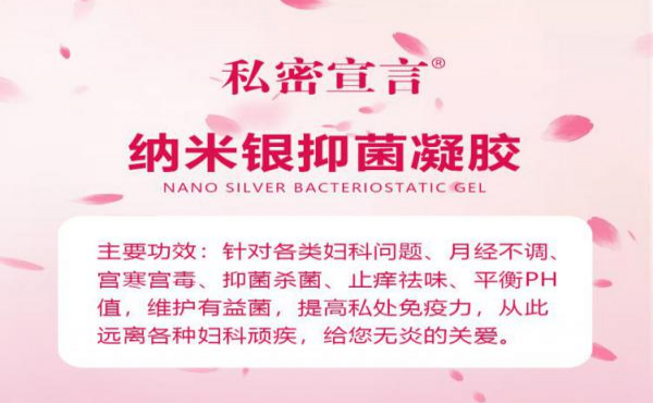 女性私密处排毒*——私密宣言纳米银抑菌凝胶。纳米银,女性私密处的排毒能手,它可以有效杀灭多种细菌、真菌,甚至是抗生素耐药菌,凭借着自身超强的渗透性,深入女性私密皮肤深处剿灭有害菌类,重点来了!它是一款非抗生素杀菌剂,使用安全,没有耐药性!此外,纳米银颗粒表面还覆盖保护膜,可以起到缓释作用,能够让抗菌效果更持久!既安全又长效,女性私密处排毒,选它就对了!