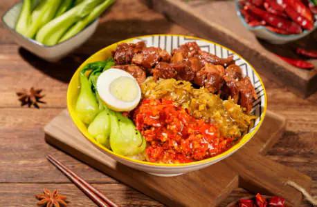 是不是单看产品名就让人流口水了?上上卤剁椒拌饭是中国人胃的福音更是嗜辣者的福音,一勺辣椒,一勺卤汁,各种肉类菜蔬,一碗米饭,看似简单的搭配,味道却不简单。剁椒拌饭放的是青红双椒,不仅起到视觉上的辅助作用,瞬间提升整碗拌饭的颜值,在搅拌均匀后香辣味直逼人吞口水,吃起来更是让人欲罢不能,越吃到后面越香。再加上上上卤家的特制卤汁卤味,汤汁饱满不油腻,香辣又下饭,吃过的人直呼过瘾。