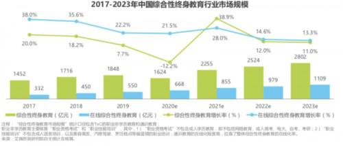 根据艾瑞数据显示,中国综合新终身教育行业市场规模以多年持续两位数增长。市场规模达千亿量级。预计到2023年,综合性终身教育市场将达到2802亿元规模;其中在线综合性终身教育市场将达到1109亿元,市场增长空间巨大。