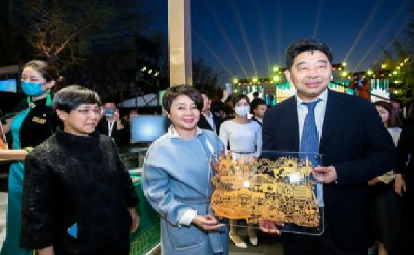 图一:SJM常务董事梁安琪(中)向杭州市人民政府副市长柯吉欣致送以「京」典传承为题的纪念品,旁为澳门特区政府旅游局局长文绮华