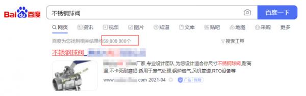 再看看上图的百度关于“不锈钢球阀”的网页收录量,达到5900万个页面。由此可以看出,这个词的优化到首页还是有一定的压力的。但是,也不能说优化不上去,关键词是看客户选择什么样技术的服务商来操作了。