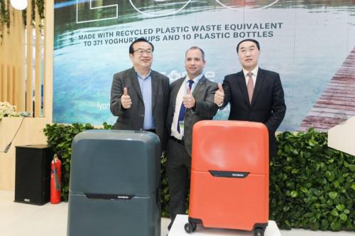 在苏伊士展台上,新秀丽集团大中华区总裁马瑞国、利安德巴赛尔中国合资企业管理及聚烯烃业务副总裁付立民、苏伊士亚洲地区固废资源管理固废基建及新服务业务总监古山主持揭幕仪式,携手推出由回收塑料制成的可持续发展系列旅行箱,展示了三方共同致力于减少碳足迹,赋予塑料废弃物第二次生命,减少原始材料的使用的愿景。