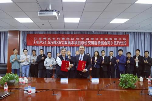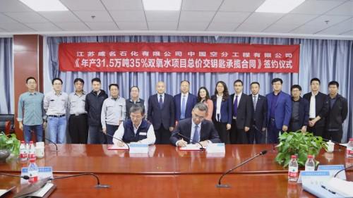 4月27日下午,中国空分工程有限公司(以下简称“中国空分”)与江苏威名石化有限公司(以下简称“江苏威名石化”)在江苏南通成功举行江苏威名石化“年产31.5 万吨35%双氧水项目总价交钥匙承揽工程”签约仪式。