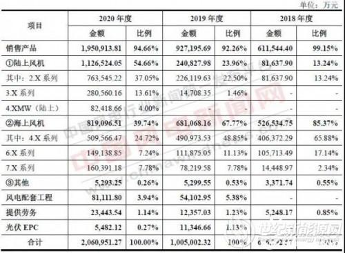 公司产品覆盖 1.25MW 到 8MW 全系列风电机组,基本实现了全功率覆盖。产品按应用场景主要可分为陆上风电机组与海上风电机组。其中, 报告期内形成销售收入的陆上风电机组主要包括 2.X 系列、 3.X 系列、4.0MW (陆上) ;海上风电机组主要包括 4.X 系列、 6.X系列、 7. X系列。同时,公司也在陆上4.X系列、5.X系列与海上5.X 系列、8.0MW 系列进行积极的产品研发与布局。