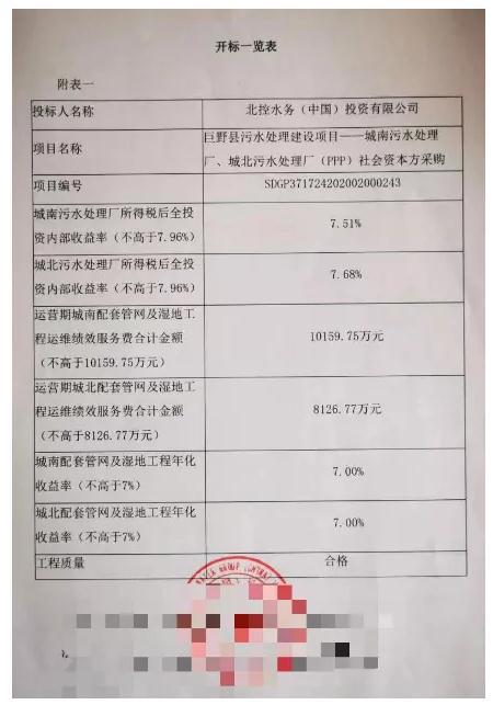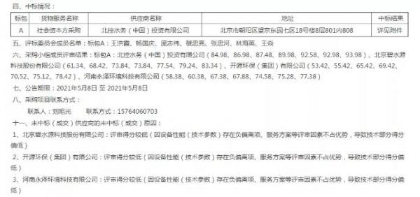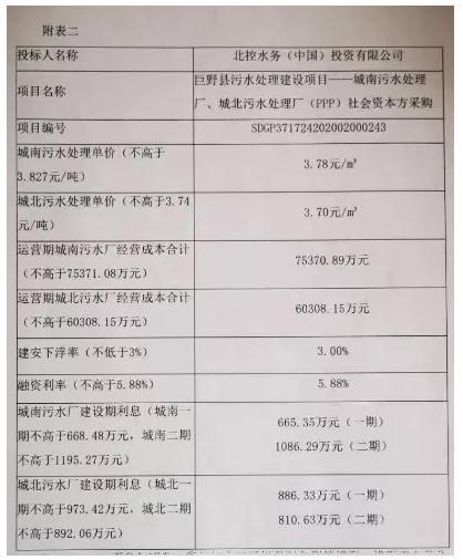 5月7日,山东省政府采购网发布了巨野县污水处理建设项目——城南污水处理厂、城北污水处理厂(PPP)社会资本方采购中标公告,中标供应商为北控水务(中国)投资有限公司,北京碧水源科技股份有限公司、开源环保(集团)有限公司、河南永泽环境科技有限公司因评审得分较低未中标。中标情况如下: