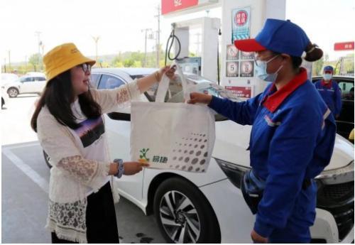 图为中国石化青海石油分公司的加油站员工向客户赠送环保购物袋