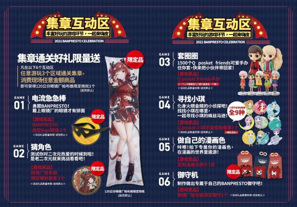本次BW嘉年华BANPRESTO占位准备了丰富纷呈的互动游戏,电流急急棒、猜角色、套圈圈、寻找小琪、制作我的漫画色、定制专属御守、帕布娘猜拳等趣味互动游戏首次亮相,达成指定条件就能赢取BANPRESTO特别定制的终极大奖!