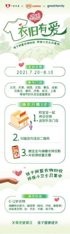 2021年7月20日起至2021年8月10日,第五届乐友“百万宝宝为爱联萌——衣旧有爱”闲置衣服公益捐赠行动正式开启。本活动依托中国儿童少年基金会“一家衣善”项目,由乐友携手歌瑞家共同发起,于乐友全国超500家门店、APP/小程序以及乐友、歌瑞家品牌的天猫&京东官方旗舰店等全渠道共同展开。