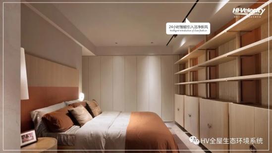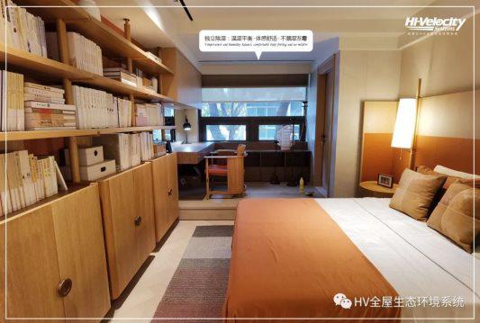 主卧带有书房,业主大多时间会在这里翻阅书籍查找资料,加上业主年近六旬,所以房间里对温度湿度的要求相当高,加拿大HV系统恒温恒湿恒氧的高标准正好符合此项需求。在HV系统营造的室内环境里,垂直温差小于1℃,可避免老年人出现忽冷忽热的不舒服体感;而经过HV系统独立湿度调节器自动调节后的室内湿度,夏度湿度低于60%,冬季湿度大于30%,可以很好的防止书籍因室内潮湿出现发霉现象,同时也完全避免了长期居住在潮湿环境中对身体的损害。