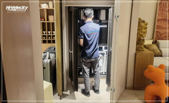 机房设置于中间相连的储藏室,整洁有条不紊,而后续HV系统的维护等事宜,只需打开机房即可解决,有别于传统空调的拆检修口甚至凿墙拆管道等复杂工程隐患。虽然机房置于室内,但由HV系统是变频主机,运行起来声音低至40分贝以下,几乎等于静音运行,完全不影响室内业主的生活及休息。