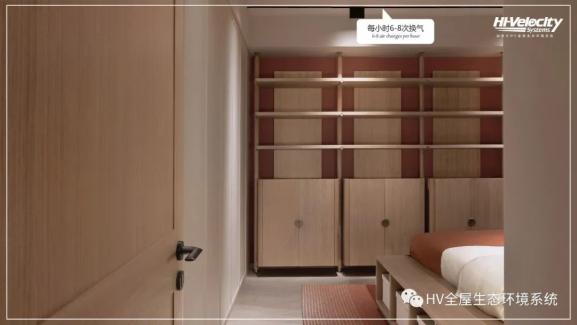 由于该老房屋层高仅2.84米,为不影响层高造成空间逼仄感,HV系统管道在设计施工时,灵活处理HV小管系统进行翻梁,借助边吊、吊顶、原有柜体装饰等细节设计施工,做到几近0占层高,充分还原空间。HV系统每小时6-8次换气,充分能保证室内氧气充足无胸闷感的同时,设备无噪音运行更能让业主静心阅读书籍及晚上有深度舒适的休息睡眠。