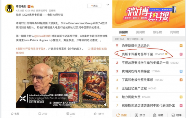 2021年4月,China Entertianmeng Group出品的“现象级”作品《2021奥斯卡前瞻·电影大师对谈》系列节目,在推出后迅速登上微博热搜Top1 ,引爆全网。1.2 亿次的视频观看浏览量、头部KOL的集体转发、门户新闻网站的报道,各方视线齐聚到节目上来。