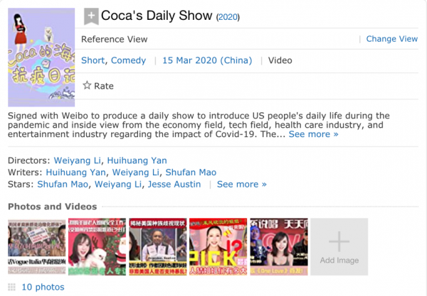 2020年3月,洛杉矶进入全面居家办公时代。15日,洛杉矶有了Covid19的病例输入,然而当时美国民众对于新冠病毒还并不甚了解,街上也没有人愿意戴口罩,毛澍凡工作的CEG公司先人一步决定开始在家办公。想象中光鲜亮丽的红毯活动和随处偶遇明星的日常,忽然间就变成了日夜颠倒的居家办公学习和每日Zoom。居家办公意味着外出拍摄的停摆,同时也就意味着民众对于新媒体内容需求的极速上升。China Entertainment Group出品的《Coca的海外抗疫日记》系列应运而生。毛澍凡作为主创团队的重要成员,承担起节目整个流程从艺术指导到剪辑发布的重任,各个环节都不容小觑。居家办公对于一个日更节目的生产制作有着巨大的挑战,她开始着手规划节目工作流,安排节目播出日程表,再根据播出计划调整制作周期并联系嘉宾,从前期撰写脚本到服化道的设计,节目录制后采集视频并后期剪辑包装,经过团队审核后定时上传网络发布节目,最后再根据节目播出状况收集反馈开会讨论。她也表示在节目制作期间,如何每日完成高质量、大信息量的创作内容的更新需求下,并同时兼顾视觉听觉的艺术表达是她一直思考的问题。“如何能在疫情的大环境的条件限制下,铺陈出新,利用后期调色、降噪及音乐辅助、多机位动画特效,合理布置场景等创新方法为节目增光添彩。”