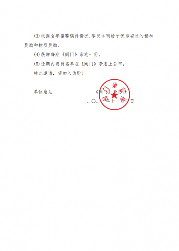 接2021年11月1日《阀门》杂志社邀请函:鉴于黄山良业项美根先生具有端正公道、治学严谨的良好道德品行以及在阀门业界享有的上佳美誉声望和深厚学术造诣,特诚挚邀请项美根同志担任本刊第六届技术委员会成员。