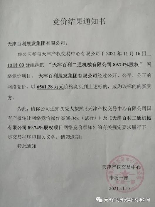 11月15日上午10:00竞拍开始,10:12分竞拍结束,天津百利展发集团为本场竞价活动最高报价方,顺利获胜!2021年11月18日11时18分,天津百利展发集团受让天津国际机械所持天津百利二通股权协议正式签订。