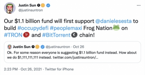 近日,波场TRON创始人孙宇晨发布推文表示,计划成立1,111,111,111美元(约11亿美元)的基金,专用于支持波场TRON生态建设,旨在为其公链生态相关区块链项目赋能,提升波场的全球影响力,从而打造顶级的公链生态系统。