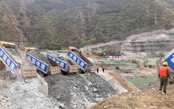 随着华能泸定公司总经理陈洪林发出截流指令后,十多台大型自卸车在现场施工人员的指挥下依次将石料倾倒入龙口。