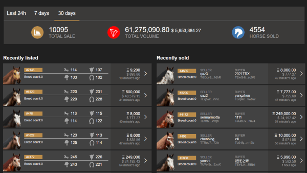 首先是近来热度最高的GameFi赛道,号称不错过任何一个热点的孙宇晨推出了备受关注的赛马游戏,对应其此前all in GameFi的言论。作为波场生态的首个GameFi项目,WIN NFT HORSE的热度从各大社交媒体的热烈谈论便可见一斑,上周其1万个盲盒在币安NFT平台上线也是秒没的状态。目前,其总销售额已超过6100万个TRX。随着币安版WIN NFT HORSE的正式上线,这一现象级P2E链游还会给波场带来更多的新用户,赋能其稳定币生态。