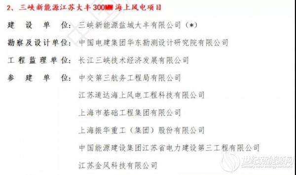 三峡新能源江苏大丰300MW海上风电项目位于盐城大丰区毛竹沙北侧海域,场址中心离岸距离72千米,水深7.5至20.9米,总装机容量300兆瓦,共安装58台风机,其中38台单机容量4.5兆瓦,20台6.45兆瓦,配套建设一座陆上集控中心、一座海上升压站和高抗站。