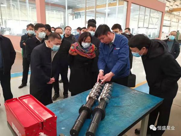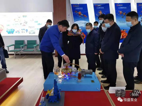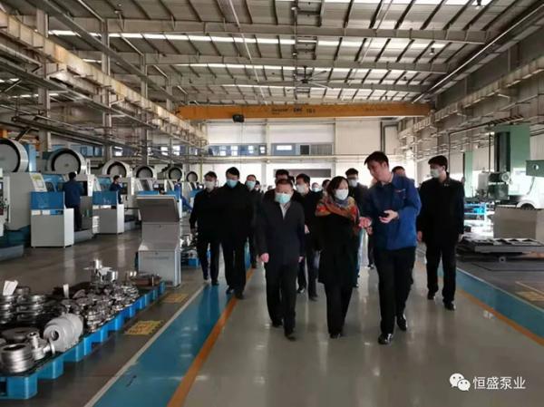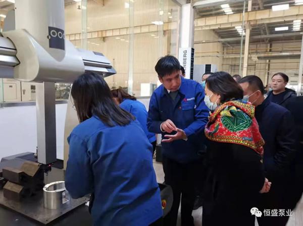 丁锦霞书记带领调研组深入恒盛泵业生产车间、产品研发中心,产品展厅认真听取企业情况介绍,全面了解企业发展历程、生产规模、工艺流程、质量控制、经营销售以及技术创新等方面情况。通过现场调研、听取工作汇报,丁书记对恒盛泵业产品质量,研发能力,知识产权和专利,产品标准制定,工艺装备,以及为国内大型项目提供配套产品给予充分肯定。