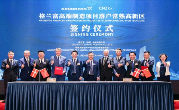 12月20日,格兰富高端制造项目正式落户常熟高新区,签约仪式在常熟会议中心举行。常熟市委书记周勤第、市领导王建国、万晓军出席签约仪式,并会见丹麦王国驻上海总领事林朗、格兰富商业建筑事业部集团高级副总裁谭征、格兰富商业建筑事业部兼亚太区运营副总裁段波、格兰富中国区总裁马克漫John Markmann一行。格兰富集团执行副总裁、首席运营官史蒂芬·西蒙内塔Stéphane Simonetta、格兰富商业建筑事业部集团高级副总裁本特·耶森Bent Jensen通过视频连线的方式参加签约仪式。