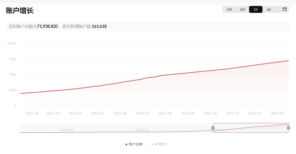 除此之外,波场在账户总数、TRX销毁量上也实现了年内翻倍增长的态势。在2021年初,波场TRON账户仅为1795万,而到了2022年1月17日其账户总数已超过了7200万,已翻超3倍。而TRX的销毁量更是让波场TRON成为币圈关注的焦点,2020年TRX总销毁量1.81亿枚,2021年TRX总销毁量为14.9亿枚,较2020年增长8.2倍。