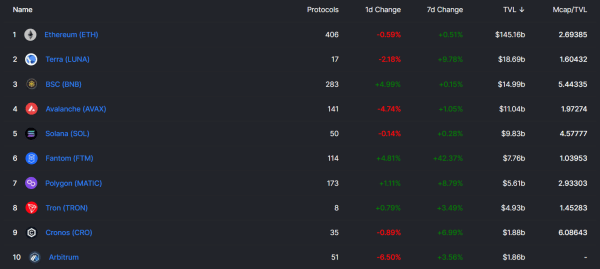 1月17日,据DefiLlama数据,在TVL排名前10 名的区块链平台中波场?TRON的市值(Mcap)/锁仓总价值(TVL)率较低,Mcap /TVL 的比值越低,则代表该区块链越被低估。也表明了波场TRX正被低估。