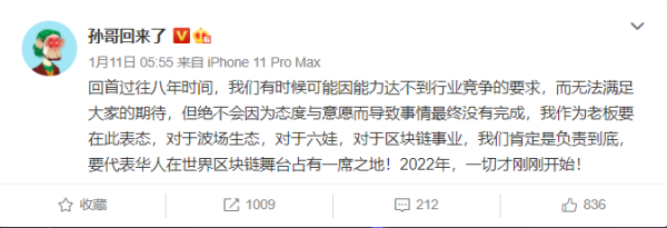 孙哥也在微博表示,回首过往八年时间,我们有时候可能因能力达不到行业竞争的要求,而无法满足大家的期待,但绝不会因为态度与意愿而导致事情最终没有完成,我作为老板要在此表态,对于波场生态,对于六娃,对于区块链事业,我们肯定是负责到底,要代表华人在世界区块链舞台占有一席之地!2022年,一切才刚刚开始!