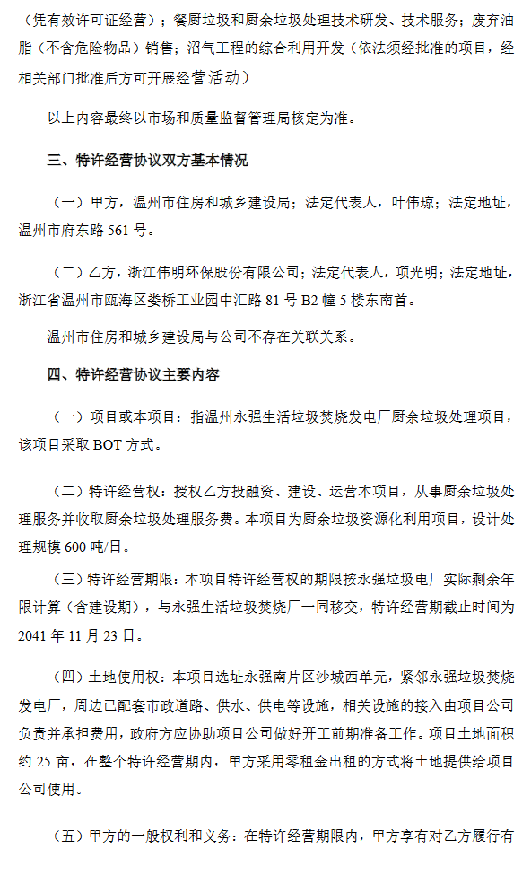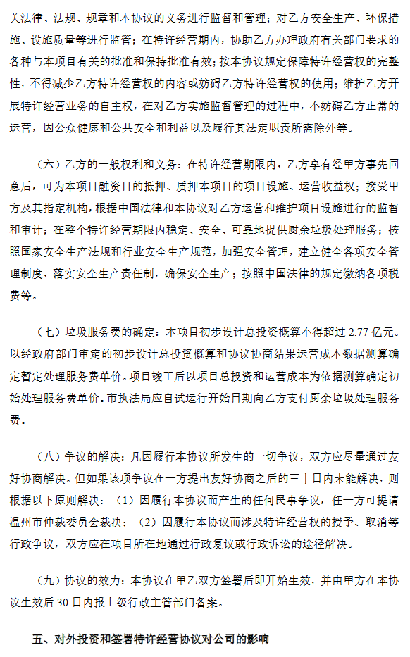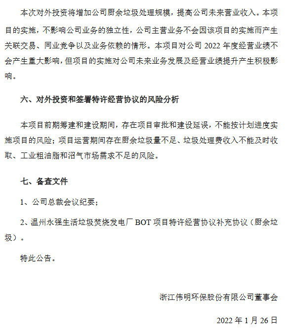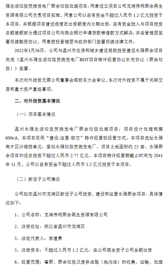 2022年1月26日,公司与温州市住房和城乡建设局就投资建设永强厨余项目完成《温州永强生活垃圾焚烧发电厂BOT项目特许经营协议补充协议(厨余垃圾)》签署。