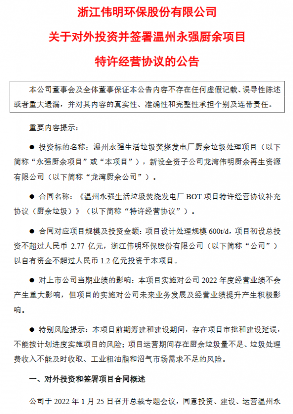 伟明环保发布公告,公司于2022年1月25日召开总裁专题会议,同意投资、建设、运营温州永强生活垃圾焚烧发电厂厨余垃圾处理项目,同意设立项目公司龙湾伟明厨余再生资源有限公司负责项目实施。同意公司以自有资金不超过人民币1.2亿元投资于本项目,并根据项目建设进度在出资额度内分期出资,自有资金投入与项目投资总额差额部分通过项目公司向商业银行申请贷款等借款方式解决,并由管理层签署后续融资协议。