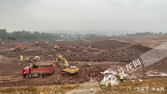 工程车及挖掘机在深基坑进行开挖作业。华龙网-新重庆客户端记者 李华侨 摄