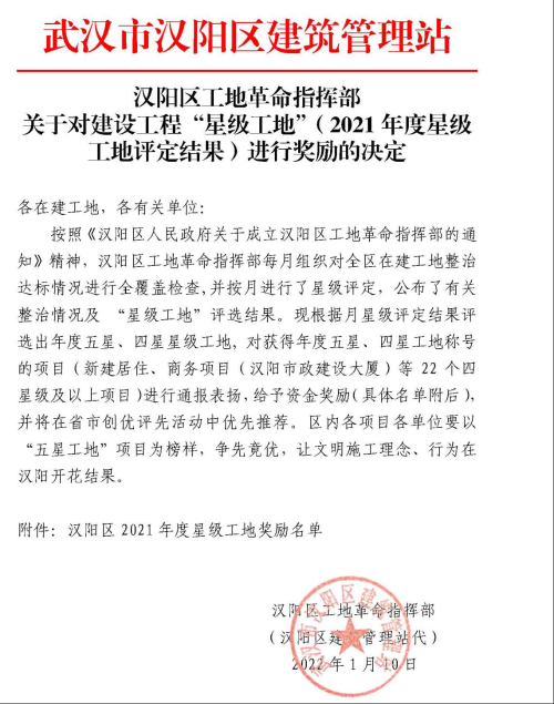 汉阳区工地革命指挥部在2021年每月组织对全区在建工地整治达标情况进行全覆盖检查,并按每个月进行星级评定;日前公布了有关整治情况及“星级工地”评选结果;根据每个月星级评定结果评选出年度四星星级工地等,对获得年度五星、四星工地称号的项目进行通报表扬,并给予资金奖励。