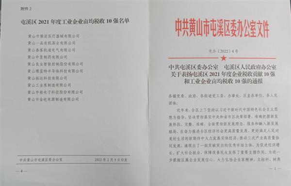 会上区委、区政府对屯溪区2021年度企业税收贡献10强和屯溪区2021年度工业企业亩均税收10强企业予以通报表扬。我公司2021年亩均税收15.56万元,荣获屯溪区2021年度工业企业亩均税收10强企业(排名第五)。