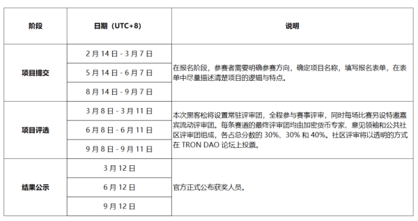 无论你是区块链/智能合约开发者、设计师还是产品经理,不管是单兵作战还是抱团取暖,都有资格报名一展身手。只要参赛者在每场比赛对应的截止日期前使用Solidity编程语言完成以上任意赛道项目的开发,并将参赛项目公布至 TRON DAO 论坛,就有资格参与评选。具体的日程安排如下所示: