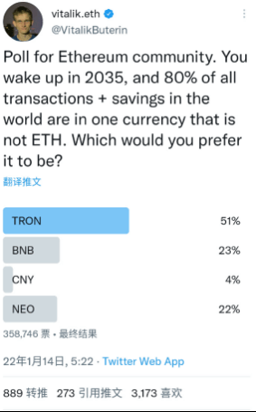 就连以太坊V神也对波场TRON特别关注,在其个人推特发起的投票活动:“在 2035 年醒来,你希望世界八成的交易、储蓄货币是除ETH之外的哪种币?”中,波场TRON以51.3%的得票率位列第一。
