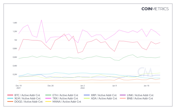 而从活跃地址数上来看,波场的用户忠诚度也是相当稳定。活跃地址数作为区块链一个重要的运营指标,用于反映链上用户的真实数量。CoinMetrics数据显示,波场TRON在活跃地址数上力压BTC、ETH、XRP、ADA、BNB、DOGE、MANA、LINK和XLM,排名第一。