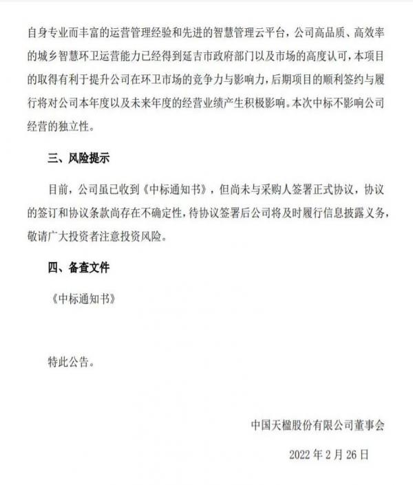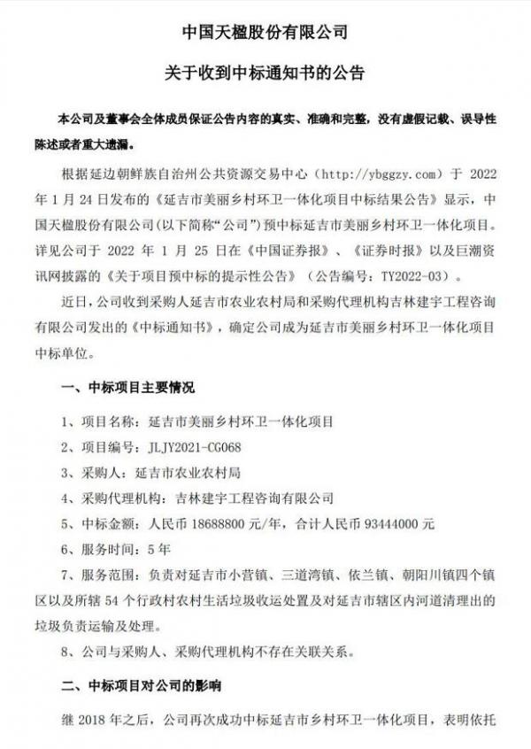 2月26日,中国天楹发布公告,公司收到采购人延吉市农业农村局和采购代理机构吉林建宇工程咨询有限公司发出的《中标通知书》,确定公司成为延吉市美丽乡村环卫一体化项目中标单位。中标金额1868.88万元/年,合计9344.4万元,服务时间为5年。
