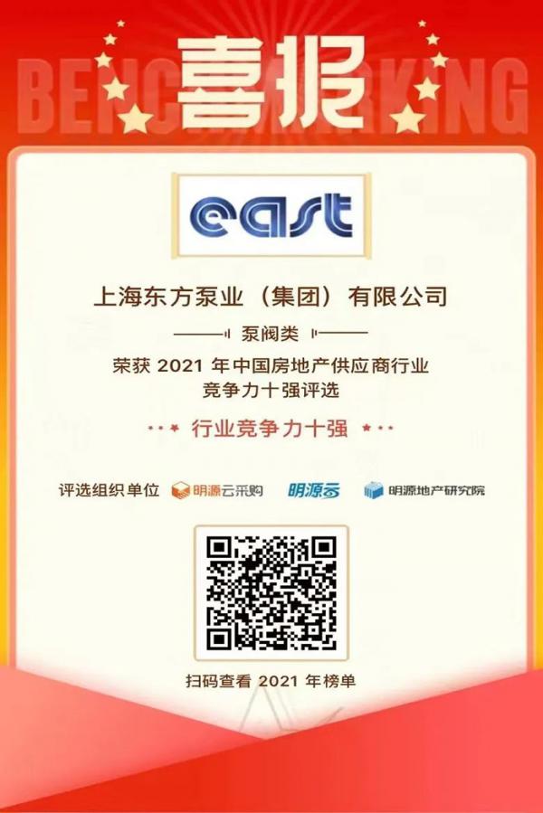 近日,上海东方泵业(集团)有限公司在明源云采购举办的第六届地产供应链行业评选榜单发布仪式上,成功入围“2021中国房地产供应商行业竞争力十强(泵阀类)”榜单,蝉联泵阀类供应商十强企业。