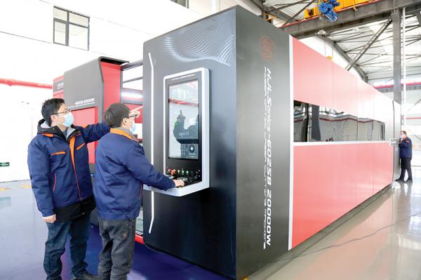 经过半个月的安装,目前,首台设备进入最后的调试阶段。第二台设备的安装工作也正同步进行中。“我们生产的机床功率为2万瓦,能对70毫米厚的碳钢进行任意二维图形的加工,在切不锈钢板和其它金属板材时最小误差控制在0.03毫米,最快速度能达到每分钟180米,精确度高、速度快。”贾俊红说。