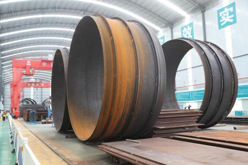 宁海抽水蓄能电站输水系统压力钢管加工厂于2022年3月上旬投产,具有标准化、自动化生产厂房,主要包括钢管生产车间、防腐车间、成品堆放场、库房等,总区域面积约14200平方米。压力钢管分为引水压力钢管和尾水压力钢管。引水隧道上平洞、上斜井(含上、下弯段)、中平洞、下斜井(含上、下弯段)、下平洞均采用钢管衬砌;尾水隧道部分采用钢管衬砌。电站输水系统需要压力钢管总量约为1.4万吨。